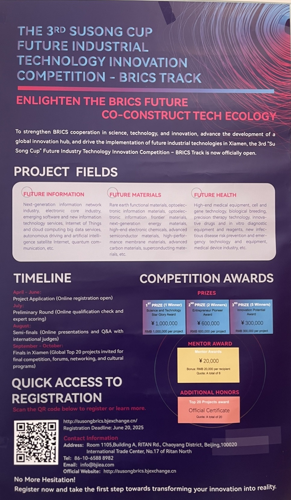 To strengthen BRICS cooperation in science, technology, and innovation, advance the development of a global innovation hub, and drive the implementation of future industrial technologies in Xiamen, the 3rd "Su Song Cup" Future Industry Technology Innovation Competition – BRICS Track is now officially open.