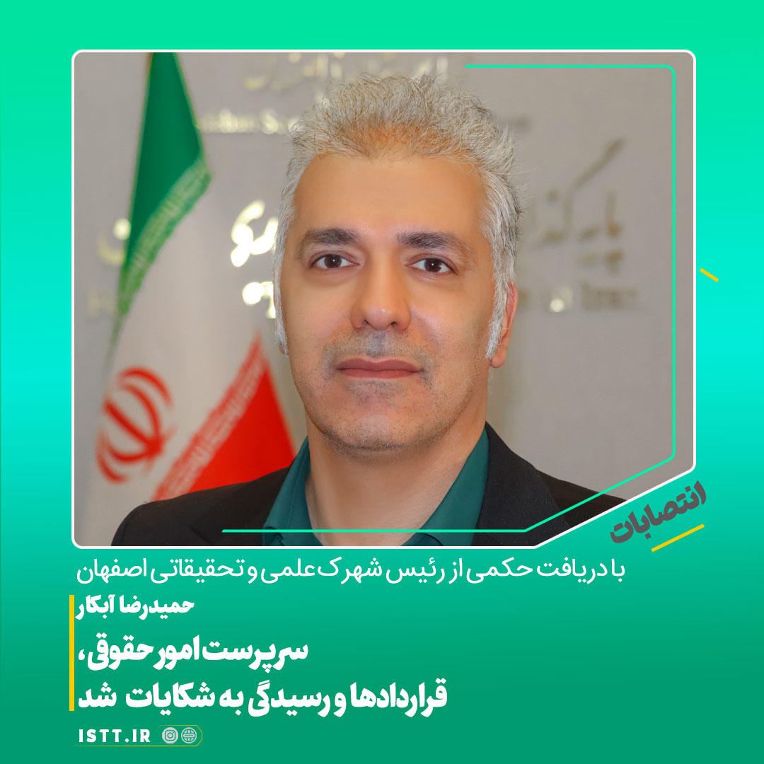 در حکم انتصاب وی آمده است: «با توجه به تعهد، سوابق ارزشمند كاری و اهتمام مؤثر جنابعالی در پيشبرد اهداف شهرک علمی و تحقيقاتی اصفهان بدينوسيله به سمت «سرپرست امور حقوقی، قراردادها و رسيدگی» به شكايات منصوب میشويد. انتظار میرود ضمن همكاری سازنده با ساير واحدهای ستادی شهرک، در زمينه نظارت بر نحوه و حسن اجرایی عقد قراردادها منعقده بين شهرک و اشخاص حقيقی و حقوقی و تنظيم متن قراردادها و رفع موانع حقوقی پيشروی واحدهای فناور و شركتهای دانشبنيان عضو شهرک، نقشآفرينی شايستهای را ايفا نماييد.»