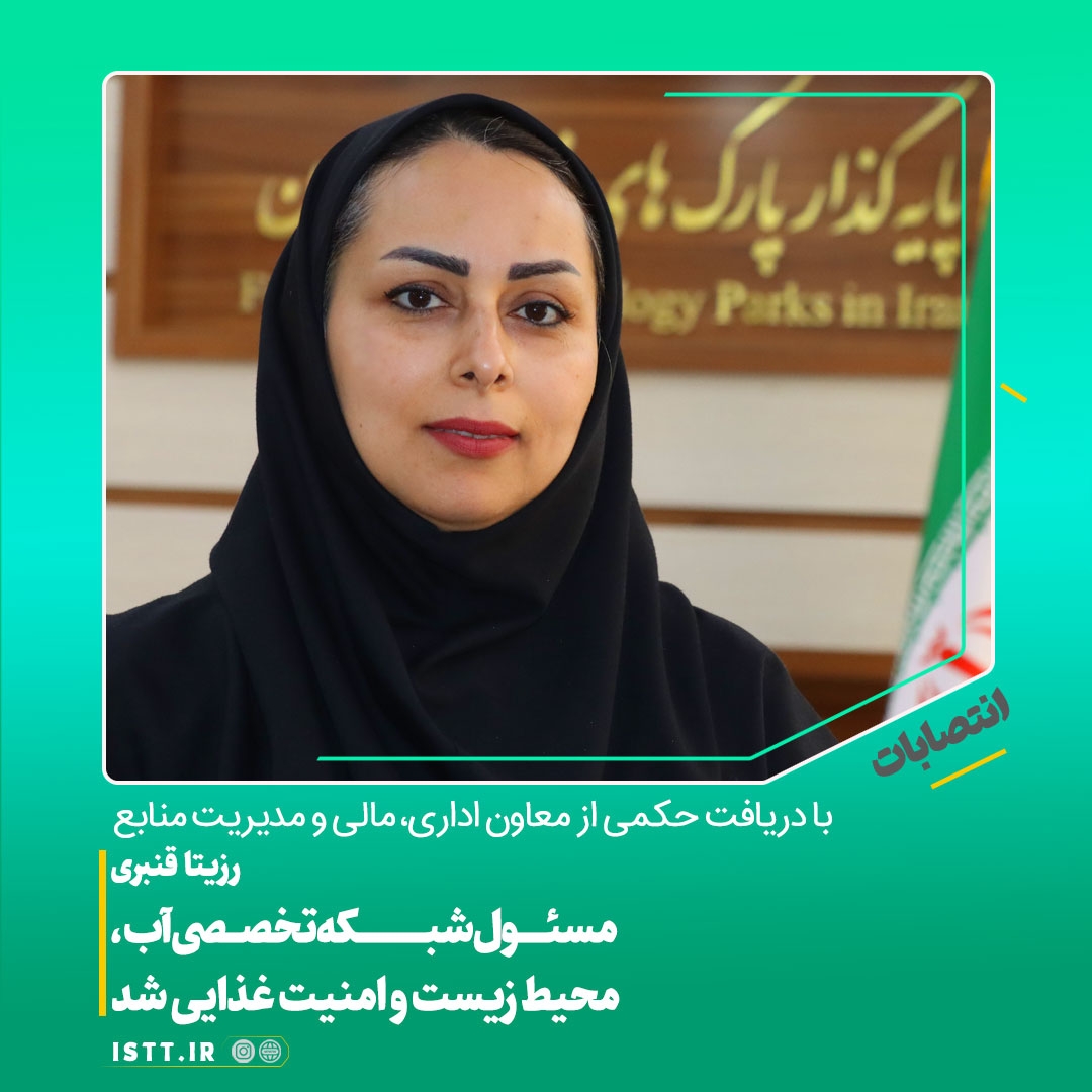 به گزارش روابط عمومی شهرک علمی و تحقیقاتی اصفهان، رزیتا قنبری با حکمی از سوی معاون اداری، مالی و مدیریت منابع این شهرک، به سمت «مسئول شبکه تخصصی آب، محیطزیست و امنیت غذایی شهرک علمی و تحقیقاتی اصفهان» منصوب شد.