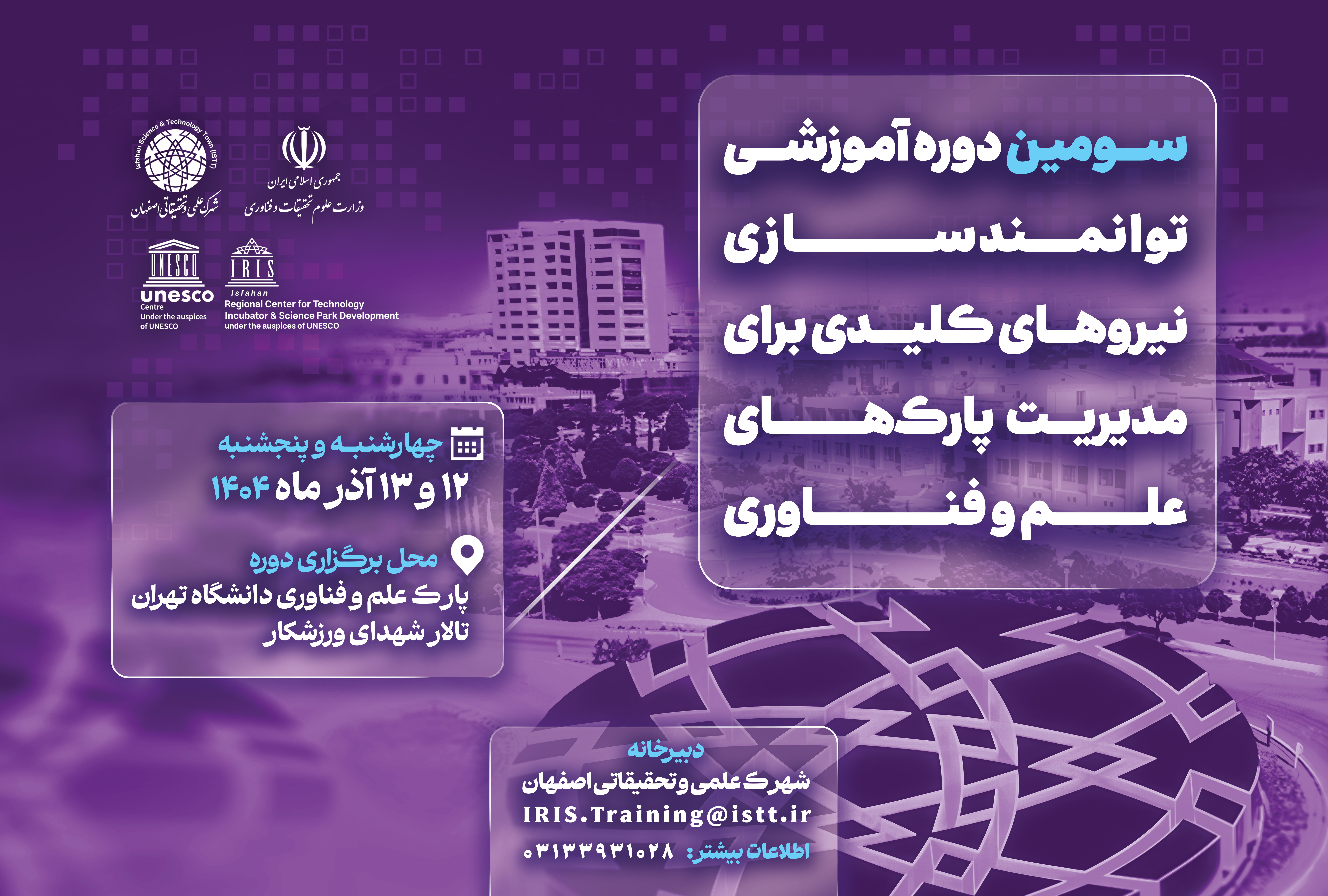 به گزارش روابط عمومی شهرک علمی و تحقیقاتی اصفهان، سومین دوره آموزشی «توانمندسازی نیروهای کلیدی برای مدیریت پارکهای علم و فناوری» فردا و پسفردا، ۱۲ و ۱۳ آذرماه ۱۴۰۴، توسط شهرک علمی و تحقیقاتی اصفهان و در پارک علم و فناوری دانشگاه تهران برگزار میشود.