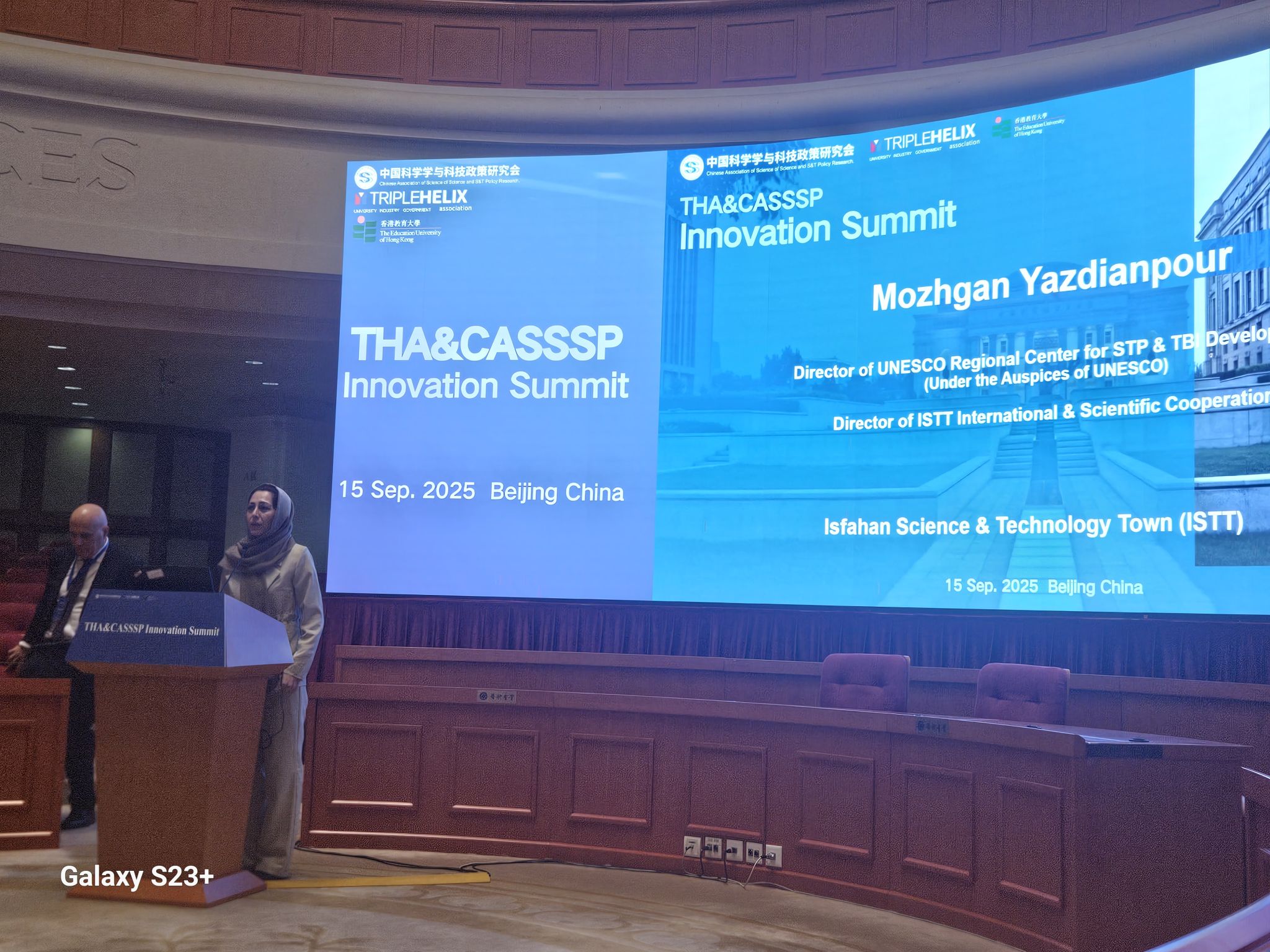 The Isfahan Science and Technology Town (ISTT) proudly represented Iran at the prestigious Triple Helix Association (THA) & CASSSP Innovation Summit, held on 15 September 2025 at the Science Hall of the Chinese Academy of Sciences in Beijing. The Summit, jointly organized by the Triple Helix Association (THA) and the Chinese Association of Science of Science and S&T Policy Research (CASSSP), brought together leading experts from universities, industry, and government across Asia, Africa, Europe, and the Americas to discuss innovation policies, entrepreneurial universities, innovation districts, science parks, governance, and AI-driven transformation.